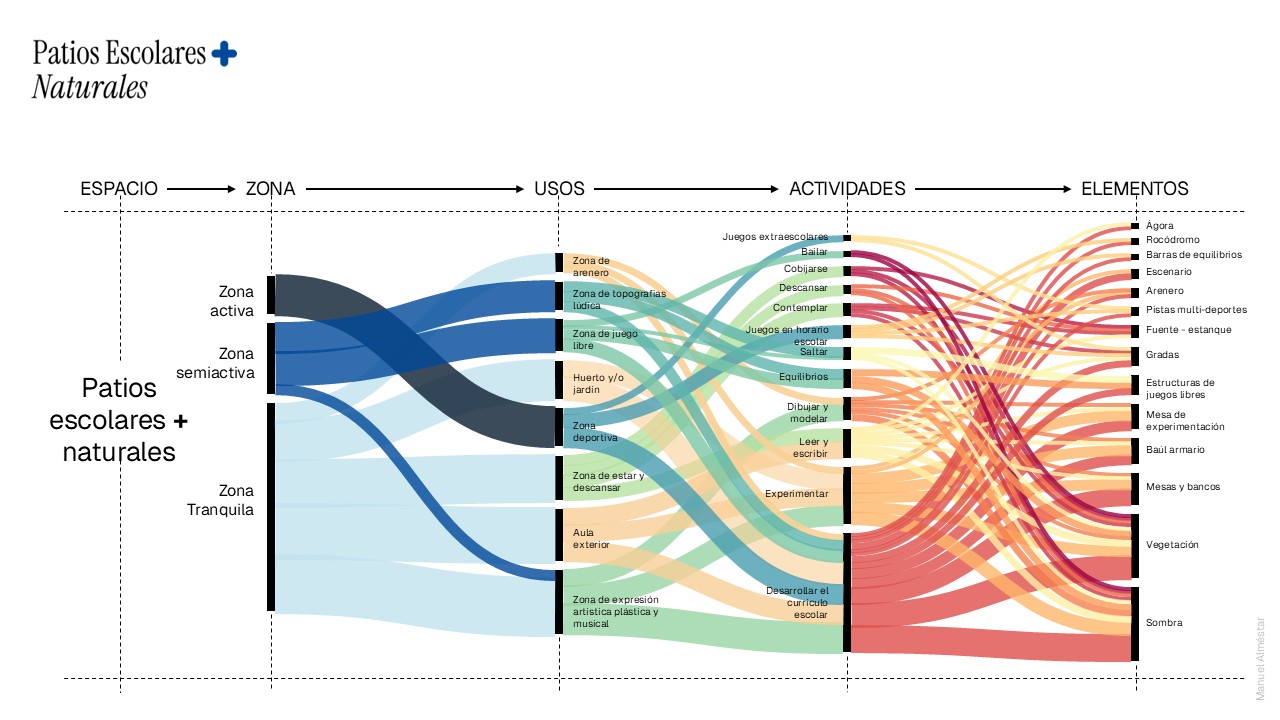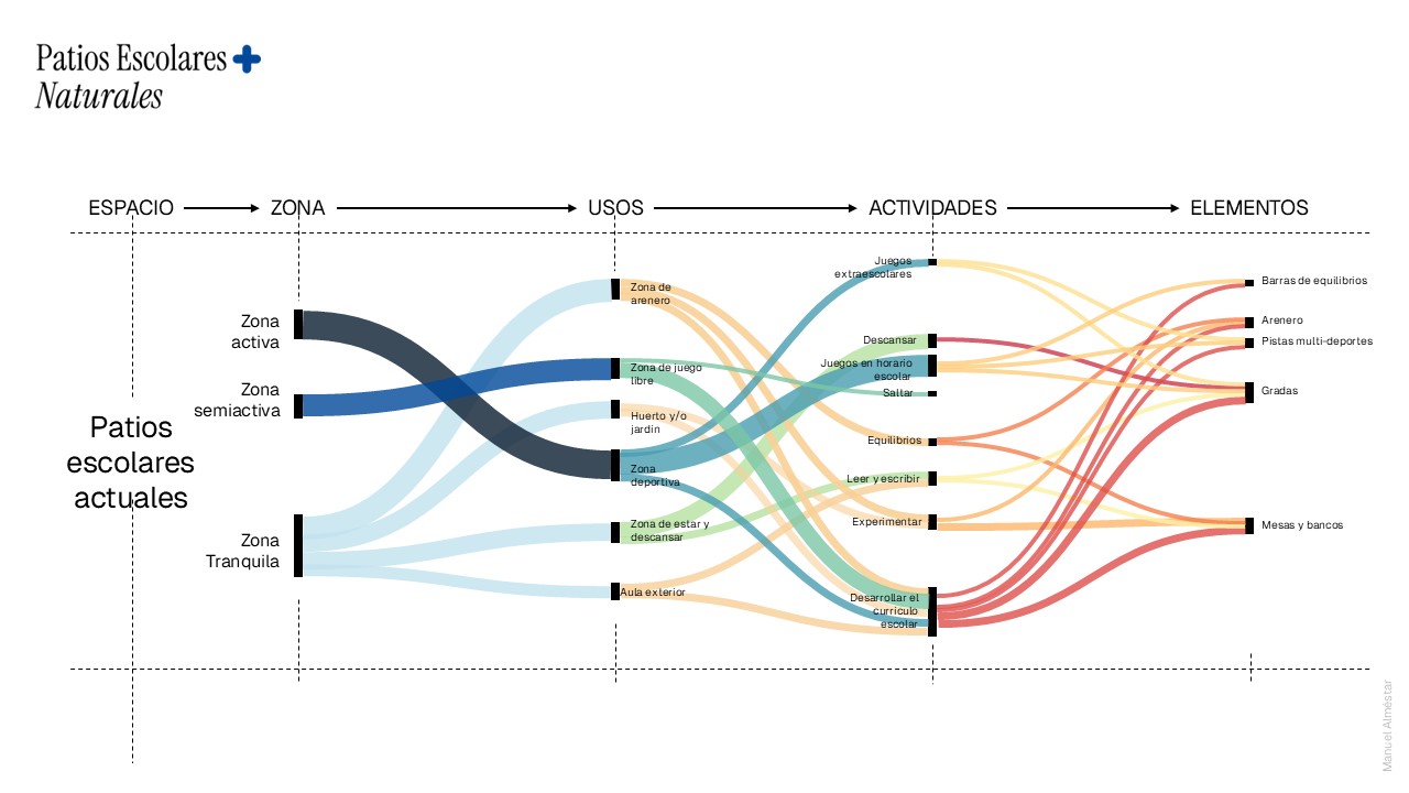 Muchos patios escolares han sido históricamente diseñados como espacios homogéneos, centrados en el deporte reglado y el juego activo. Esta configuración limita las posibilidades de aprendizaje, juego diverso y convivencia equilibrada. La primera imagen muestra un esquema típico de este tipo de patios, en contraste, la segunda imagen que ilustra el potencial de un patio renaturalizado, diverso y multifuncional para crear un entorno de aprendizaje y juego más rico y equitativo. Este modelo favorece una experiencia integral para todos los alumnos, atendiendo a distintos intereses, necesidades y momentos del día.